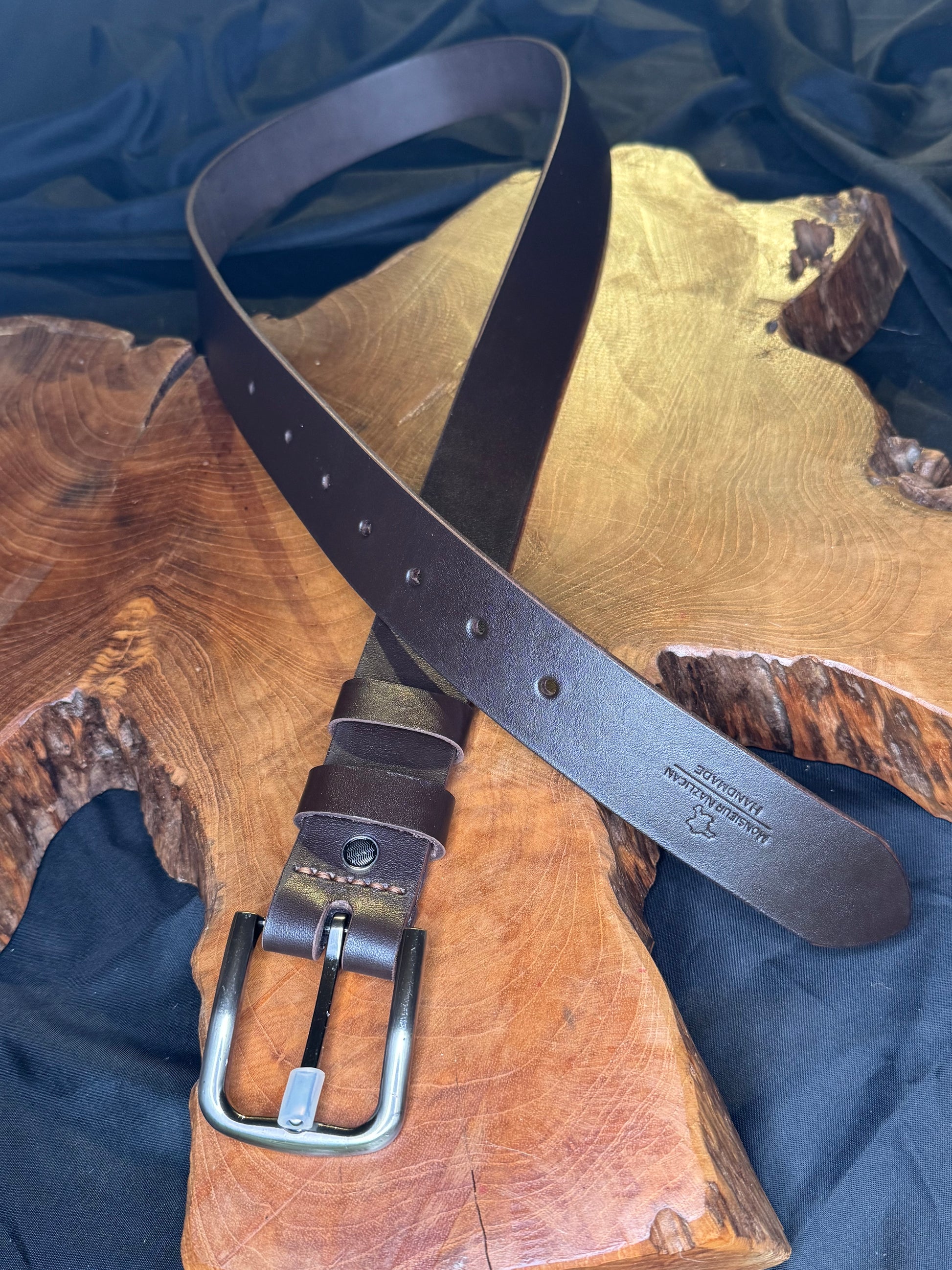 Ceinture homme marron foncé couture à la main 90 cm, 4 mm d’épaisseur, boucle en zamak
