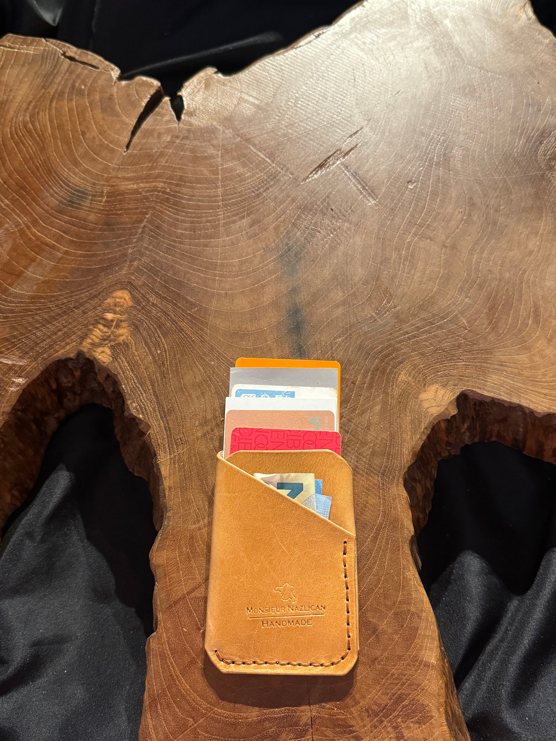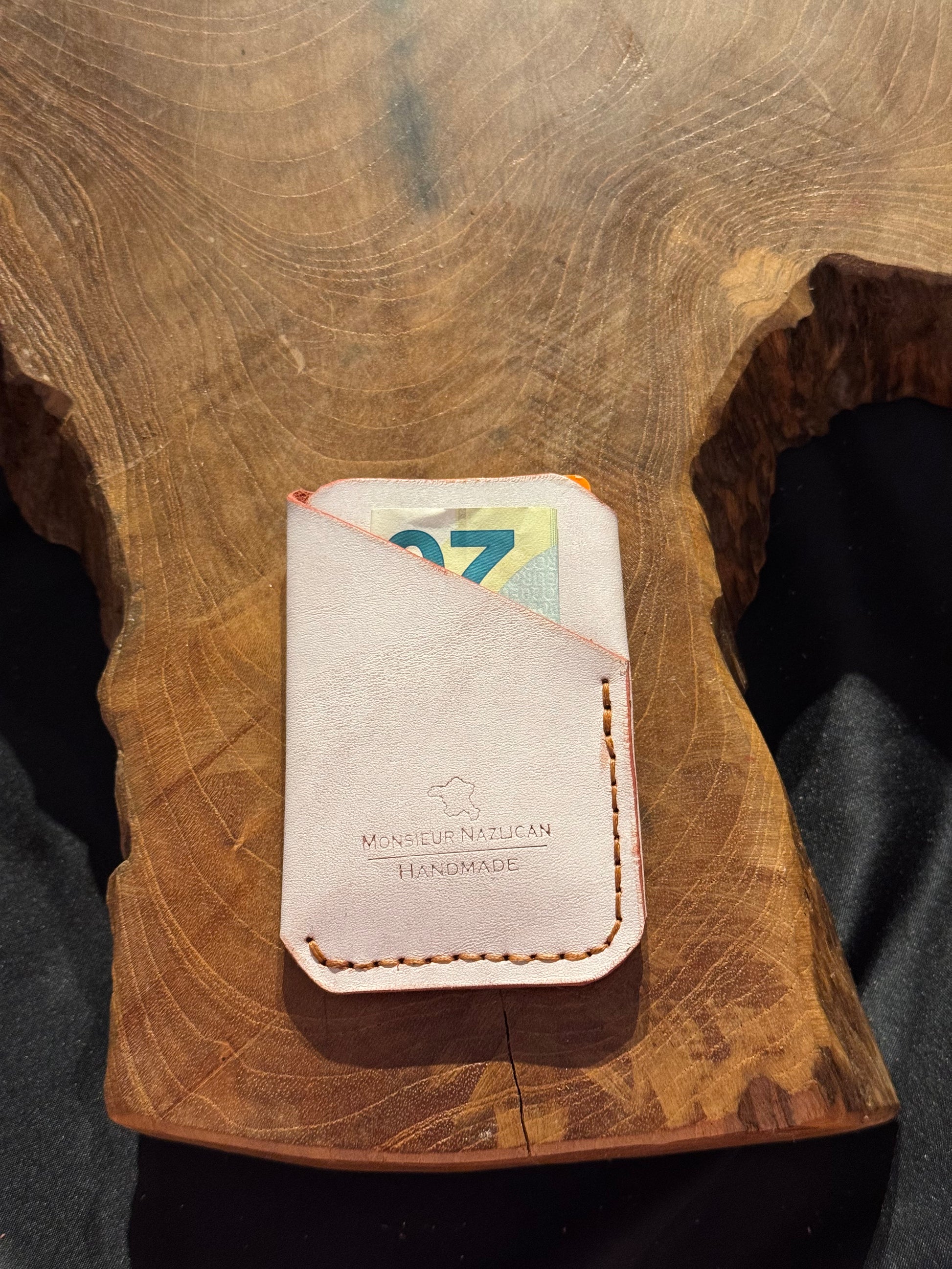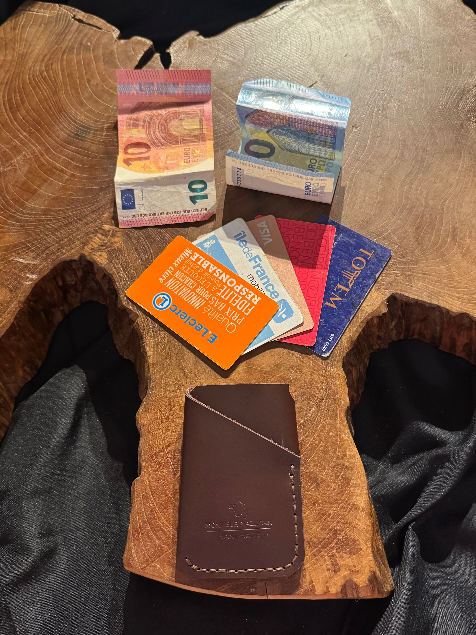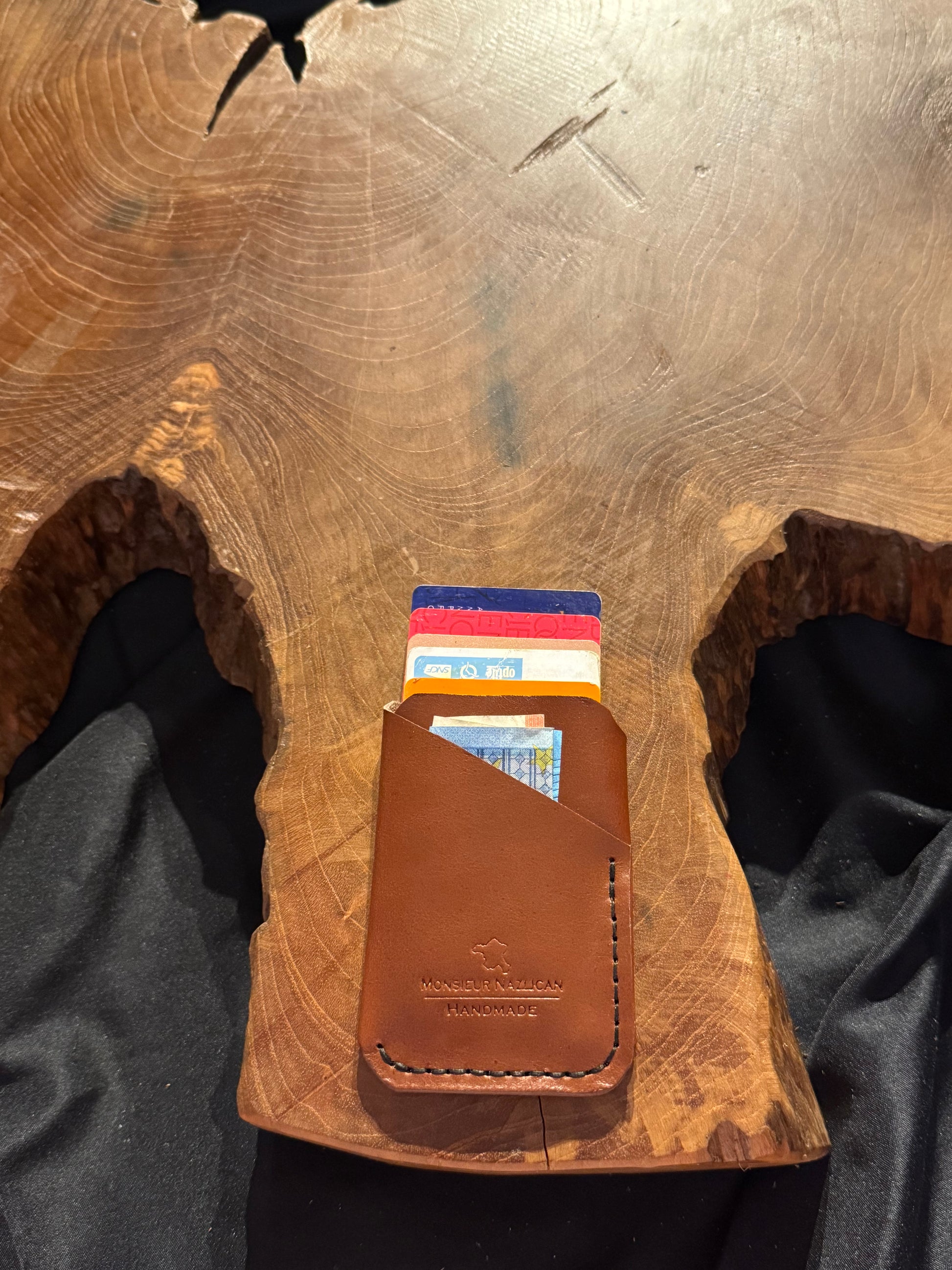 Porte-carte classique, cuir de vachette italien, couture à la main. Capacité de 6 cartes et une poche d’espèce