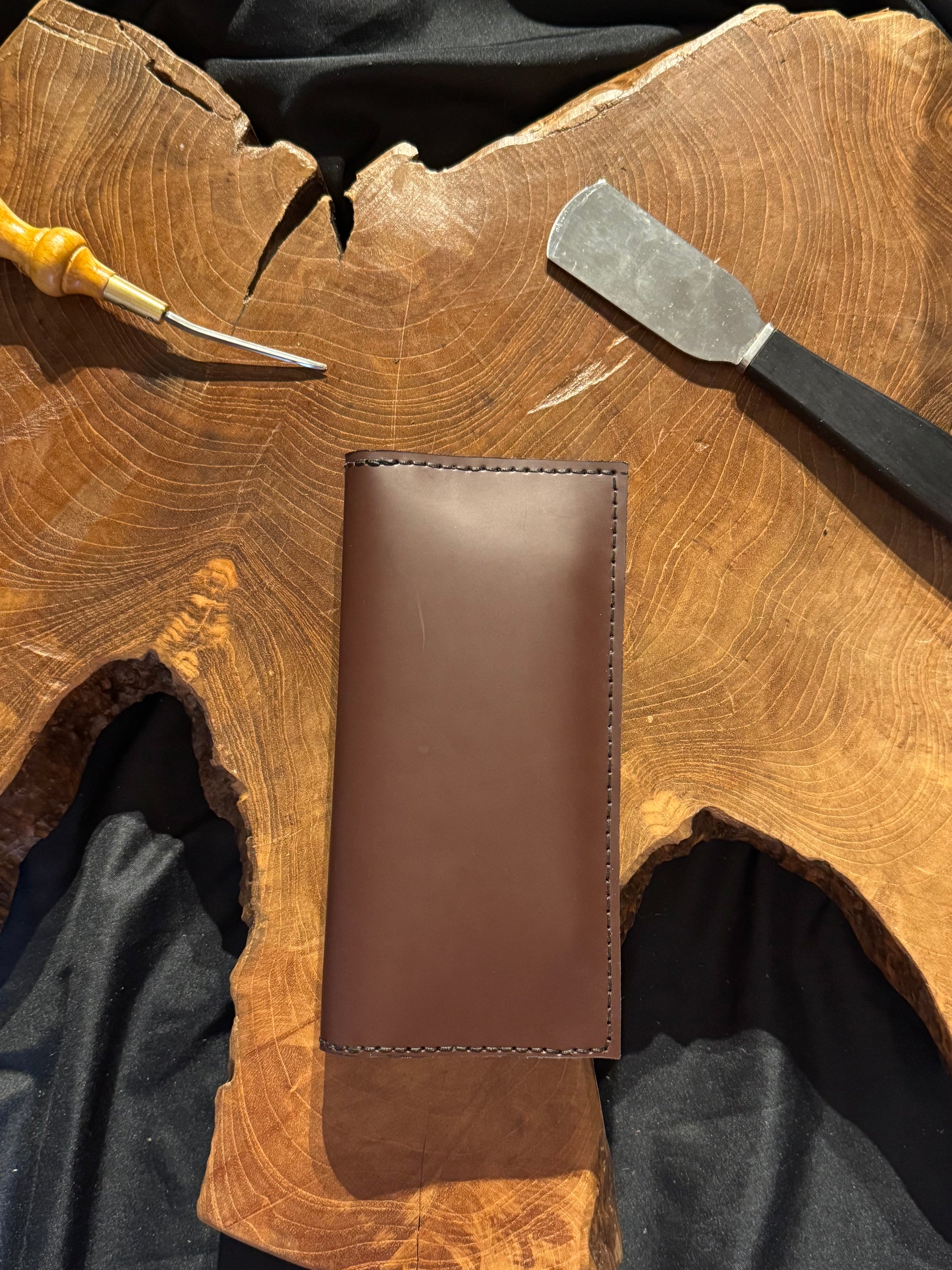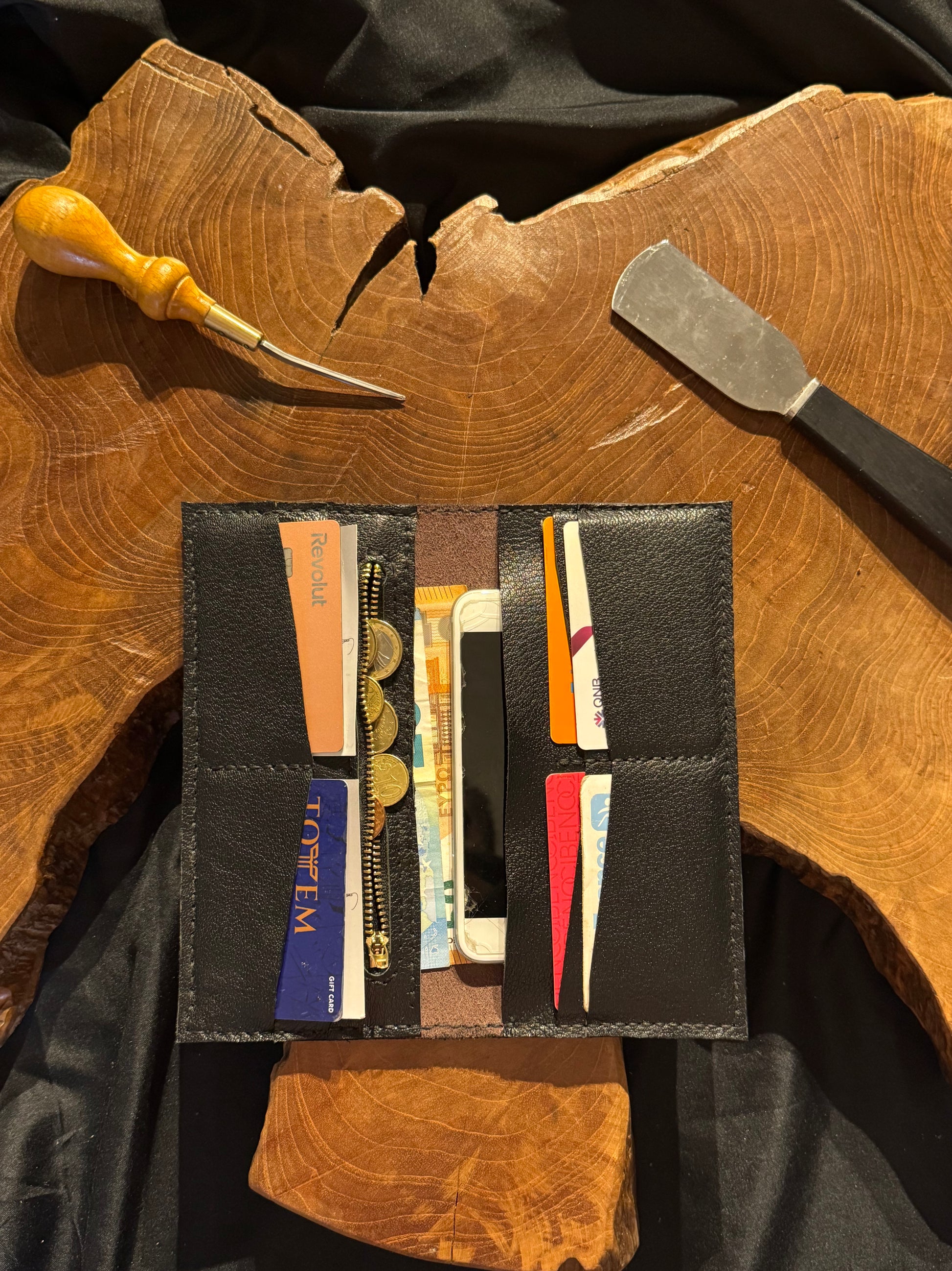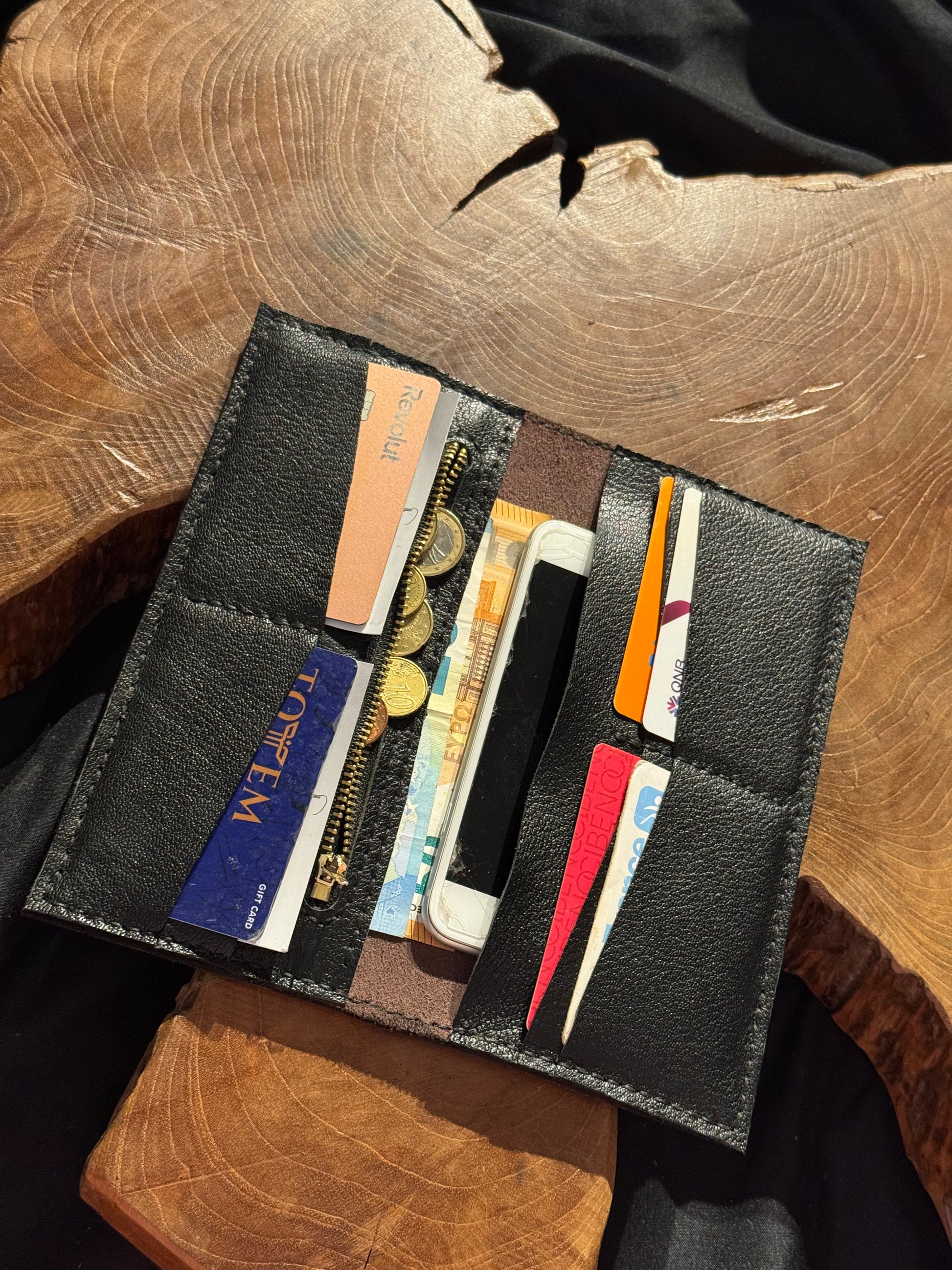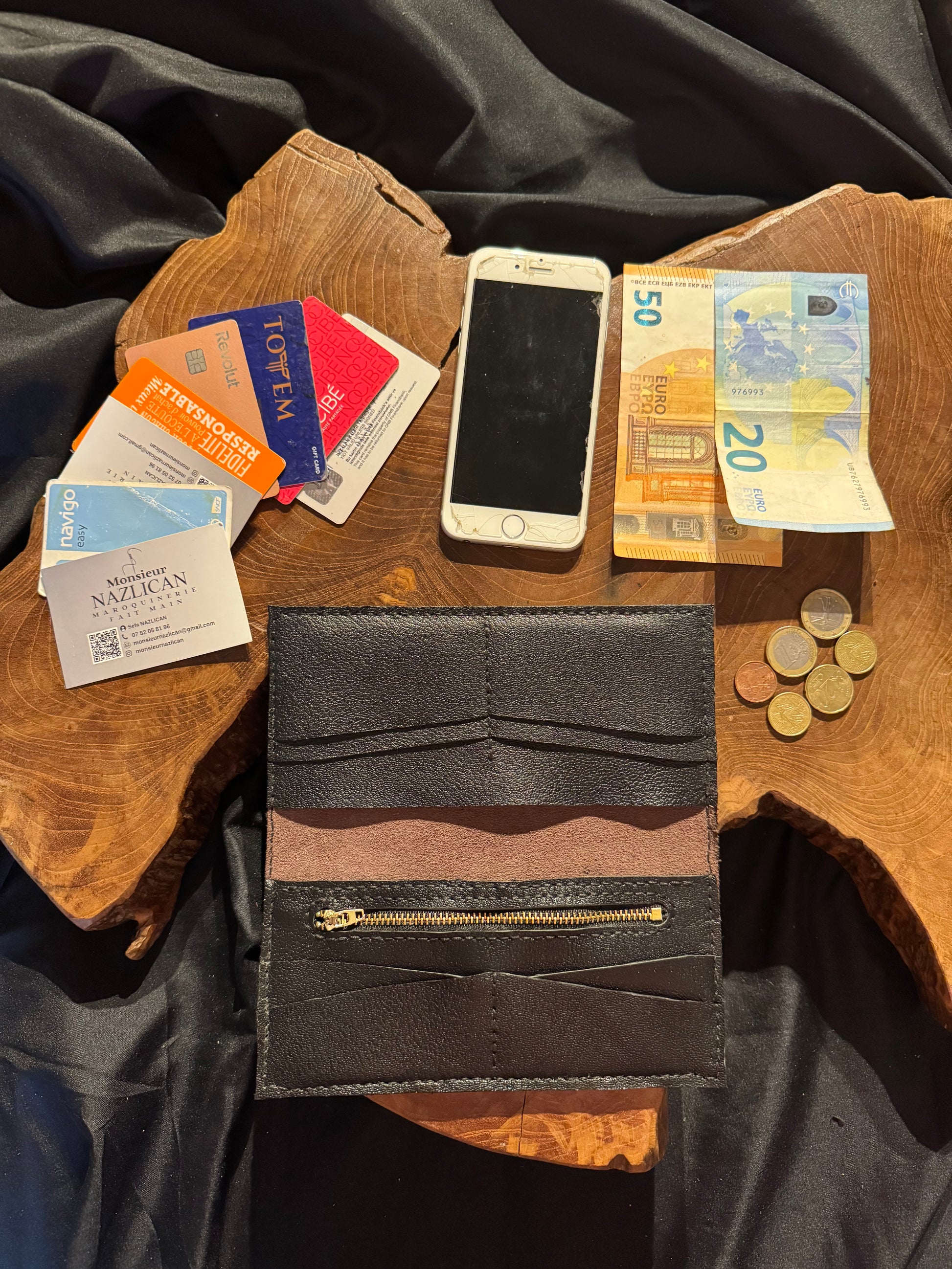 Portefeuille longue fait main, capacité de 8 cartes, une poche d’espèce, une poche de monnaie et une poche de portable.